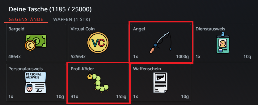 Sobald du ausgerüstet bist, kannst du zu einem Angelspot gehen, deine Angel auspacken und einen Köder auswählen – und schon kann’s losgehen!