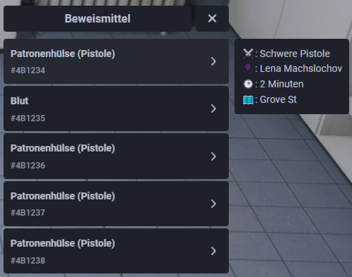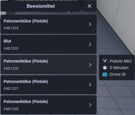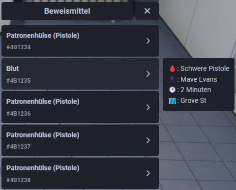 Das Beweissystem sorgt dafür, dass jede Straftat Spuren hinterlassen kann – genau wie in der Realität. Beamte können mit Taschenlampen Beweise sichern, die für Ermittlungen entscheidend sind. Diese Beweise können ausgewertet werden um Straftäter zu überführen.